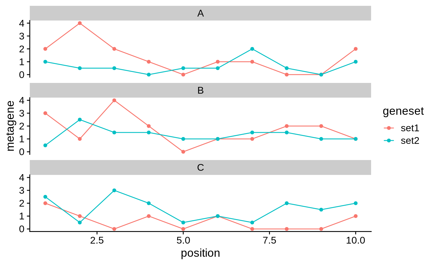 #> #>#>#>#> #>#>theme_set(theme_cowplot()) # Prepare example data ---- sample_names <- c("A", "B", "C") se_list <- generateDeeptoolsExperiments(20, 10, sample_names) se_list#> $A #> class: RangedSummarizedExperiment #> dim: 20 10 #> metadata(0): #> assays(1): matrix #> rownames(20): GR_1 GR_2 ... GR_19 GR_20 #> rowData names(0): #> colnames(10): 1 2 ... 9 10 #> colData names(0): #> #> $B #> class: RangedSummarizedExperiment #> dim: 20 10 #> metadata(0): #> assays(1): matrix #> rownames(20): GR_1 GR_2 ... GR_19 GR_20 #> rowData names(0): #> colnames(10): 1 2 ... 9 10 #> colData names(0): #> #> $C #> class: RangedSummarizedExperiment #> dim: 20 10 #> metadata(0): #> assays(1): matrix #> rownames(20): GR_1 GR_2 ... GR_19 GR_20 #> rowData names(0): #> colnames(10): 1 2 ... 9 10 #> colData names(0): #># Split each sample into gene subsets ---- range_sets <- list(set1=c("GR_1"), set2=c("GR_2", "GR_3")) se_list_list <- lapply(se_list, splitByGeneSet, range_sets) # Usage ---- x <- makeMetageneDataFrame(se_list_list) ggplot(x, aes(position, metagene, color=geneset)) + geom_line(aes(group=interaction(geneset, sample))) + geom_point() + facet_wrap(~sample, ncol=1)